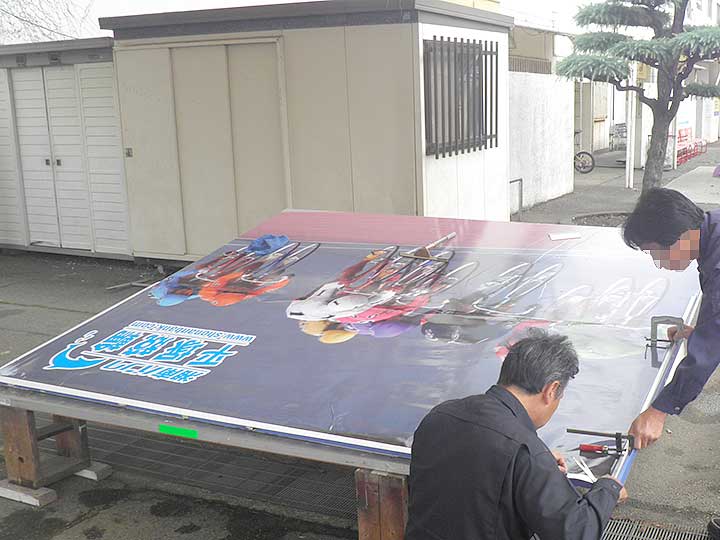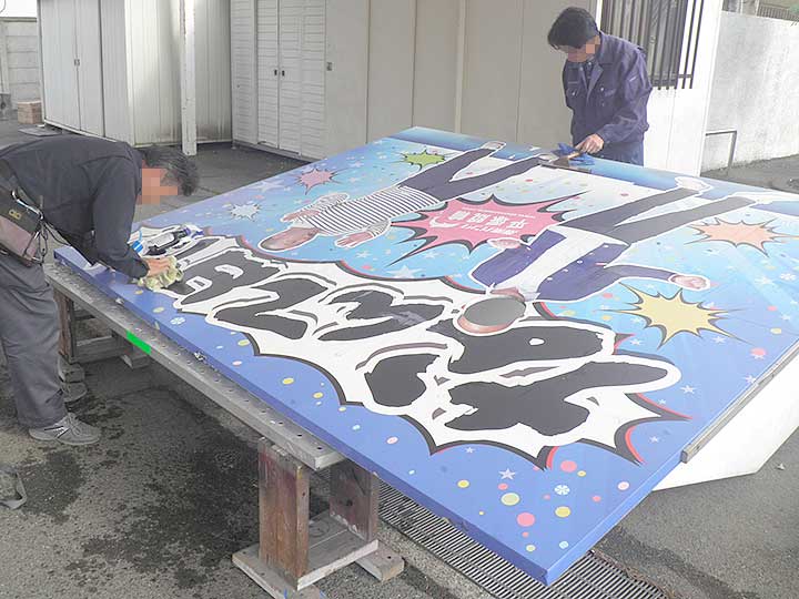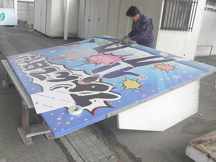 上から写真とロゴマークをプリントした塩ビシートを貼り付けます。