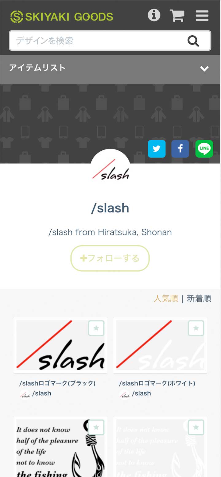 オリジナルプリントグッズの作成サイト、SKIYAKI GOODS(スキヤキグッズ)へ/slashブランドのデザインを登録いたしました。