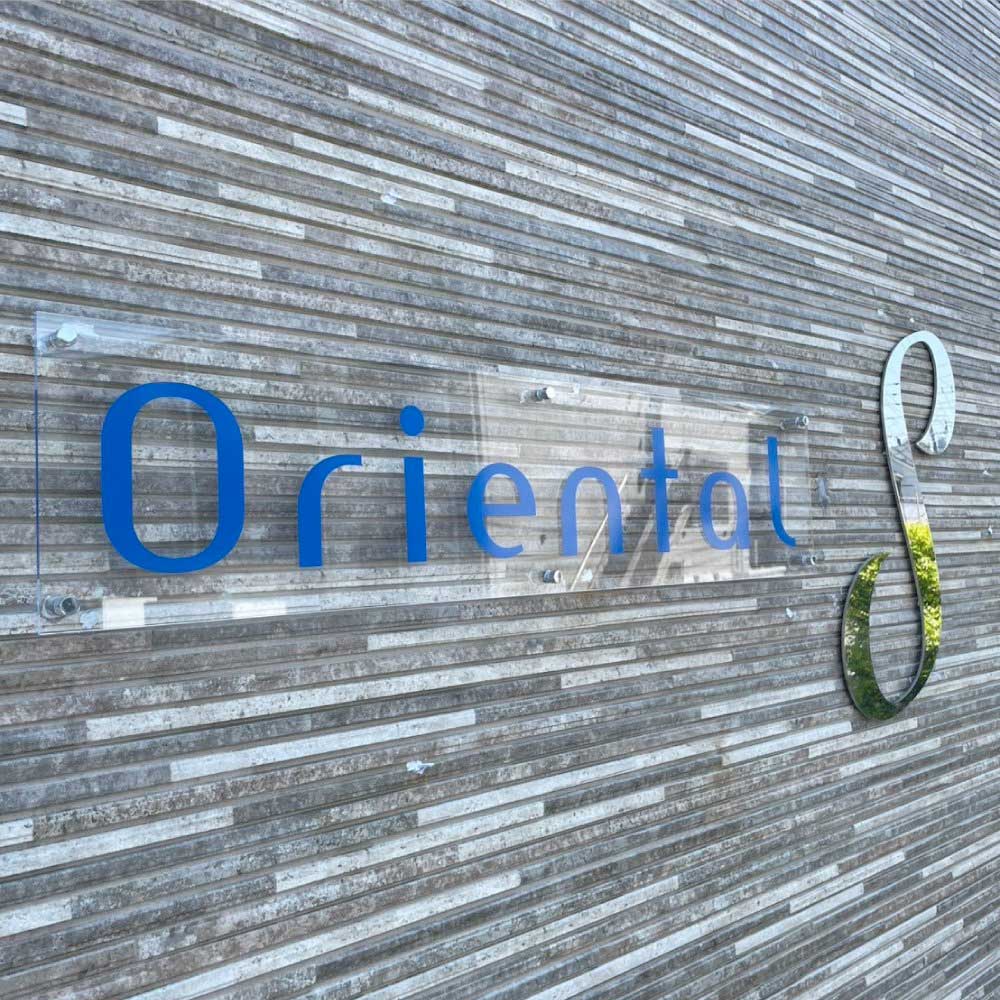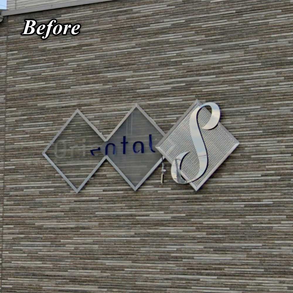 左側の「Oriental」の部分はアクリル板にマーキングフィルムの文字を貼っています。右側の「S」はステンレスの鏡面仕上げで既存のものをそのまま使用しています。