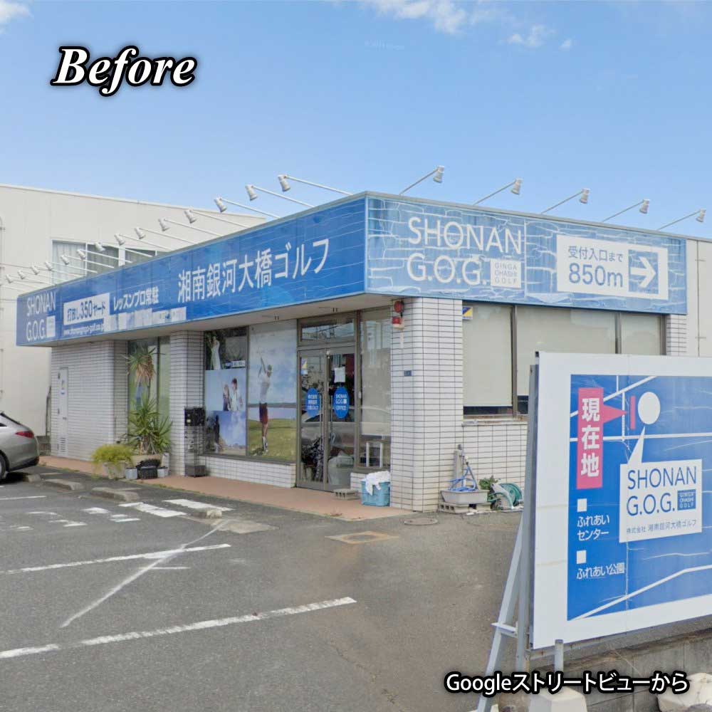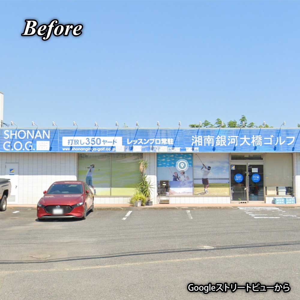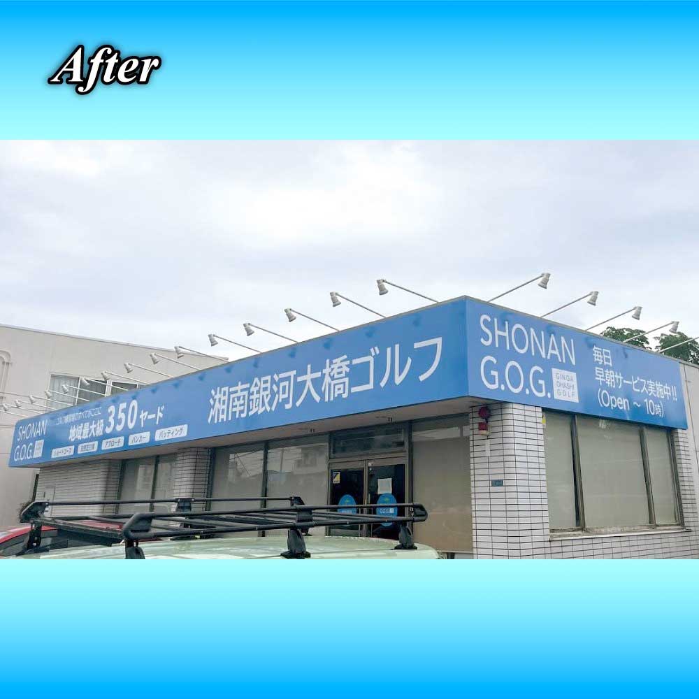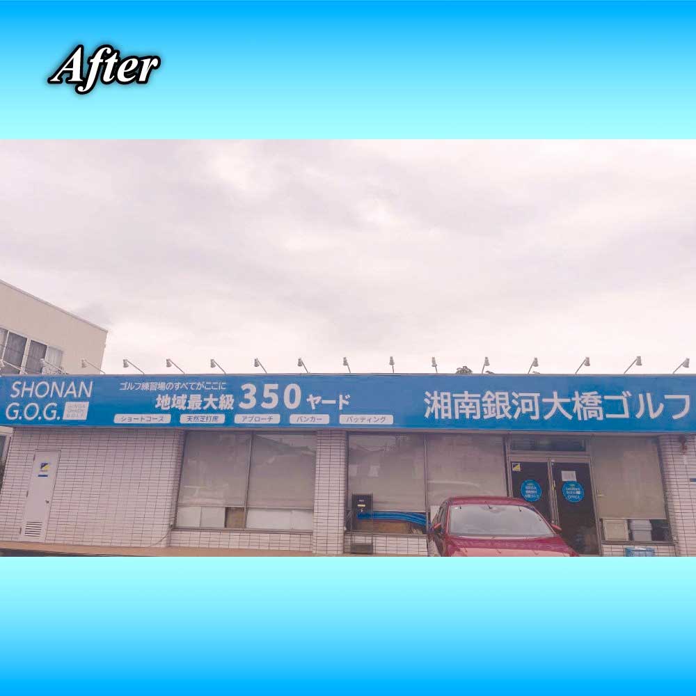 神奈川県平塚市四之宮のゴルフ練習場、湘南銀河大橋ゴルフ様の事務所看板とウィンドウサインのリニューアル工事を承りました。
