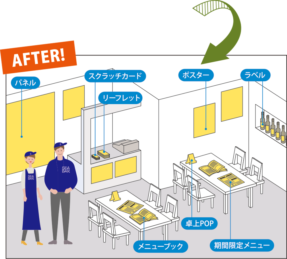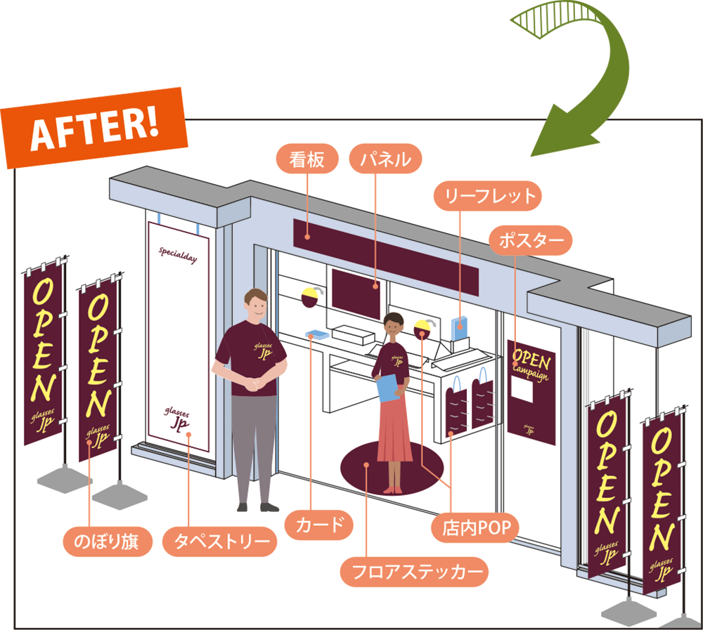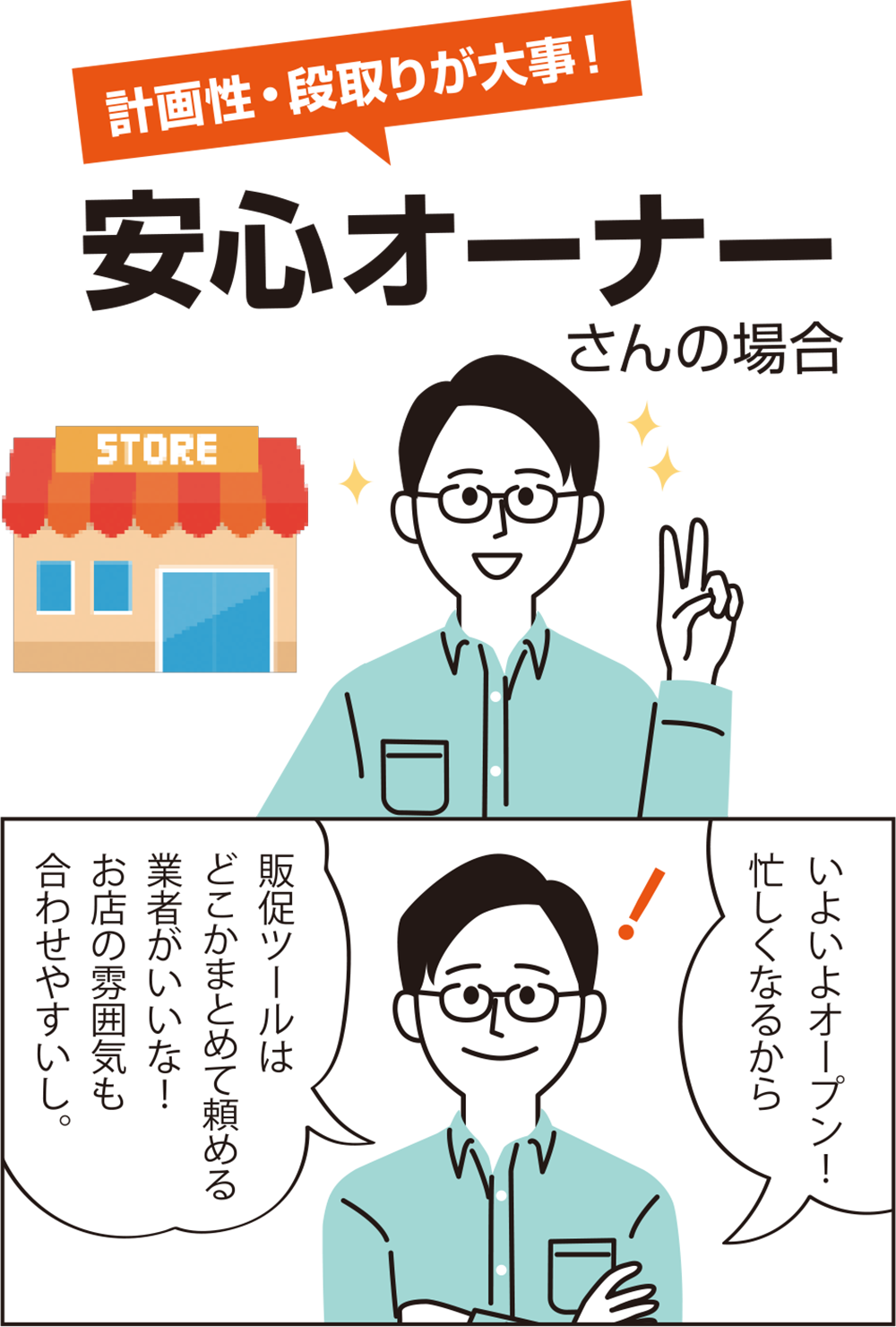 店舗に活気が感じられず入店しにくい、何を扱っているのかわかりにくい。効果的な販促ツールは思わず入りたくなくなる雰囲気づくりに貢献します。