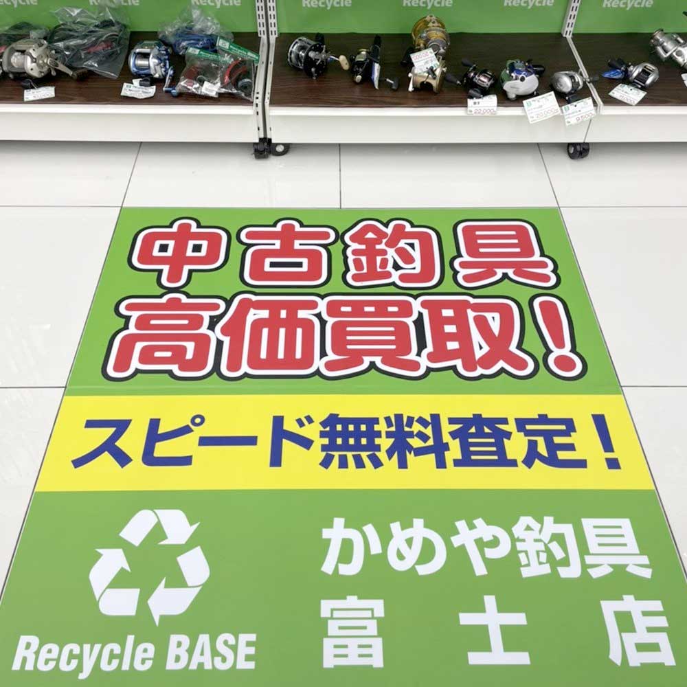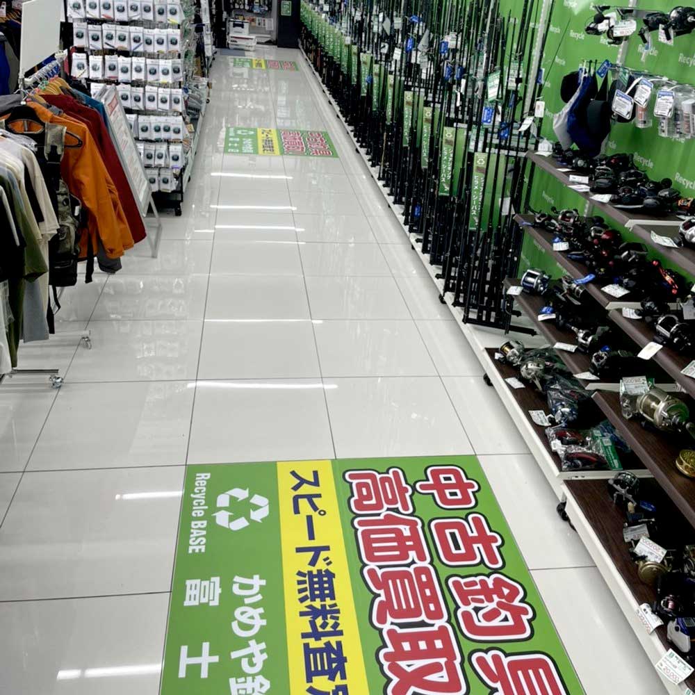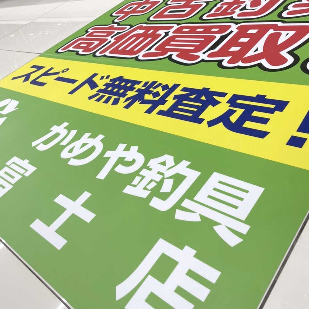 静岡県富士市米之宮町にある釣具店、かめや釣具富士店様にて中古釣具買取強化の告知用フロアサインを施工いたしました。 今回のフロアサインは塩ビシート(インクジェットメディア)に溶剤系インクジェットプリンタで出力したシールタイプのものですが、置くだけのゴムマットタイプも選択いただけます。