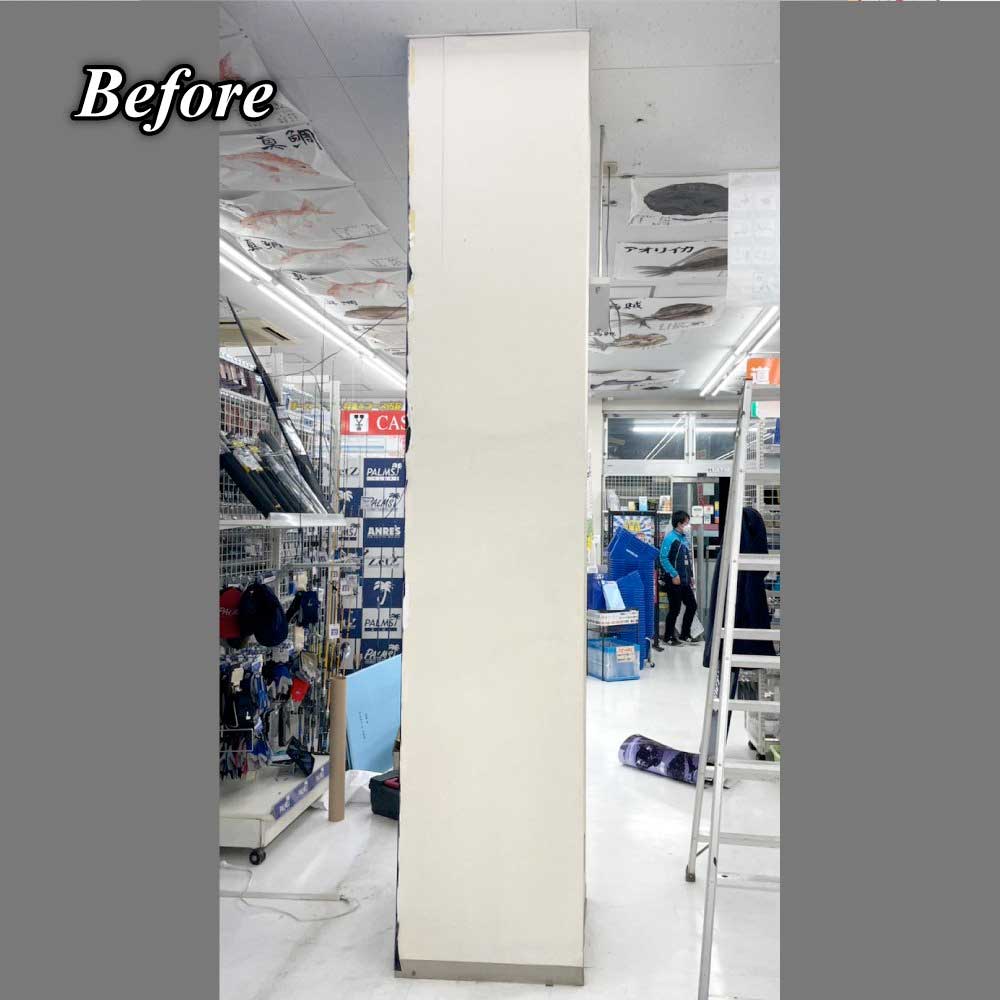 同じく平塚市に拠点を置く釣具メーカー、弊社のお客様でもあるパームス様の商品陳列棚付近にある柱です。