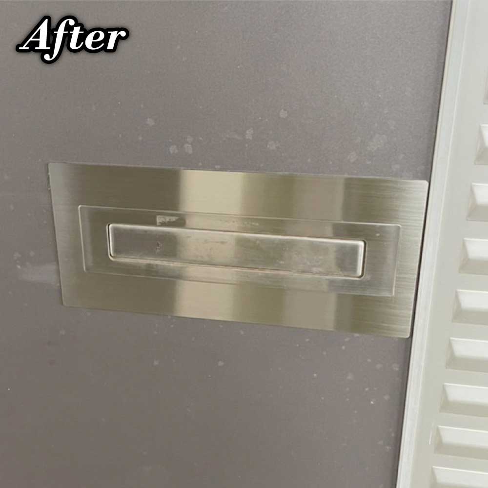 神奈川県茅ヶ崎市美住町のアパート改修工事にて、玄関ドアポストの補修工事を行ないました。 ポスト周辺のサビを除去し、ステンレスの化粧枠を新設しました。 弊社は便利屋系の事業者ではございませんが、今回は元請け様のご依頼により承りました。